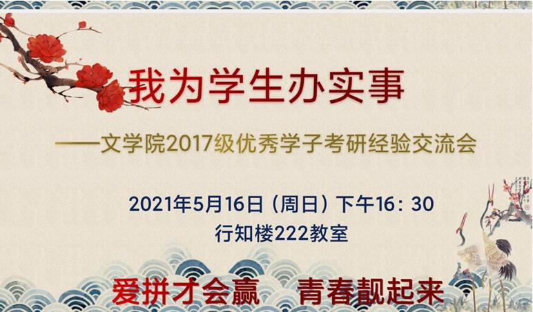 2021年5月16日,汉语言文学系、汉语国际教育系、秘书系共同策划的“beat365官网网页版2017级优秀学子考研经验交流会”在行知楼222教室举行,会议的主题是:“爱拼才会赢,青春靓起来”。