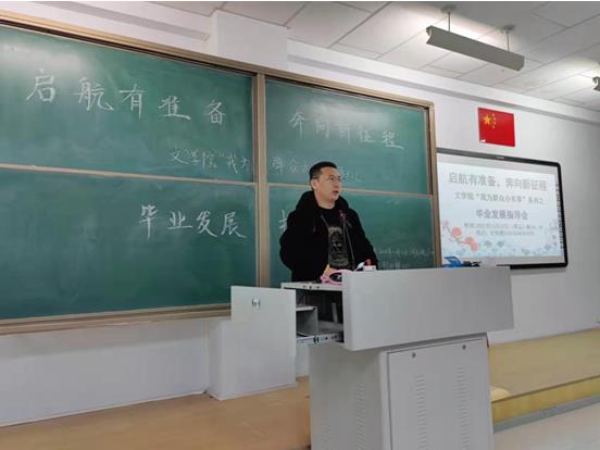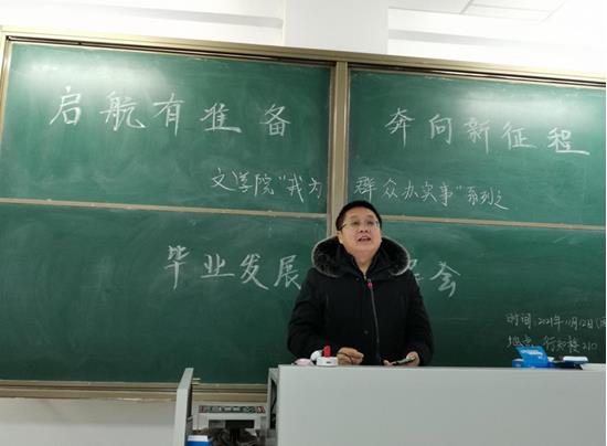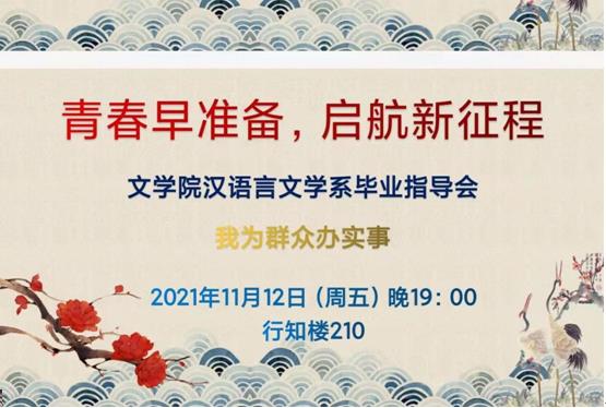 2021年11月13日,beat365官网在盛乐校区行知楼210召开了主题为“启航有准备,奔向新征程”的毕业生发展指导会。本次会议由汉文系、汉语系、教务办共同举办,教工一支部书记刘伟博士、汉语言文学系副主任胡素莲博士、教务办公室吴永盛老师出席了会议,汉文系、汉语系、秘书系全体毕业生共300余人参加了会议。