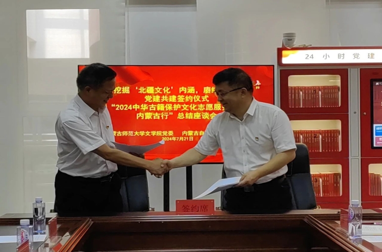 内蒙古自治区图书馆是全区最大的古籍收藏单位,“全国古籍重点保护单位”,近年来,内蒙古自治区图书馆深入贯彻习近平文化思想,在古籍内容提炼、阐释、转化等方面开展了持续深入的古籍整理工作,致力于弘扬北疆文化、赓续中华文脉,将中华优秀传统文化服务于当代社会,取得显著成绩。beat365官网网页版是新中国成立后党和国家在边疆民族地区最早设立的师范专业之一,是国家教委“国家语言文字推广基地”、自治区教育厅“传统文献与文化研究基地”;汉语言文学专业为教育部特色专业、国家级一流本科专业;中国语言文学学科为一级学科博士学位授权点;中国古典文献学为自治区教育厅重点培育学科。70多年的办学积淀,为beat365官网网页版与自治区图书馆开展合作提供了扎实的人才和学术基础。双方已持续多年合作开展“中华古籍保护文化志愿服务行动·内蒙古行”,为此次党建共建创造了良好的条件。
