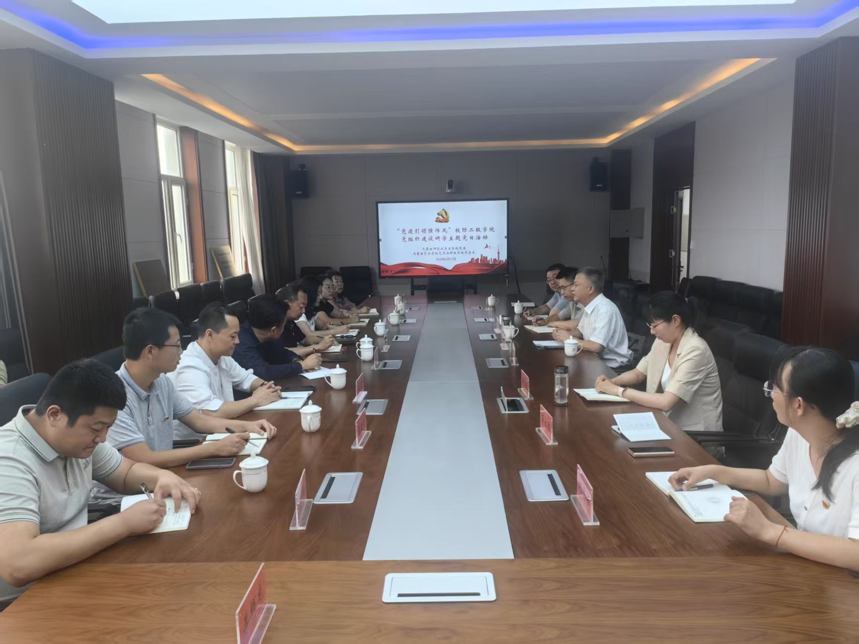 6月27日下午,beat365官网网页版党委和内蒙古艺术学院艺术与科技学院党总支开展“党建引领强作风”校际二级学院党组织建设研学主题党日活动。beat365官网网页版党委书记韩彦斌及各党支部书记、综合办公室主任,艺术学院艺术与科技学院党总支书记姚建东,党总支副书记、副院长段建华及各党支部书记、环节干部、教师代表、学生代表等参加活动。活动在beat365官网网页版盛乐校区学院楼beat365官网网页版进行。