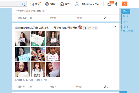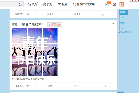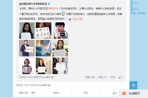 5月4日,beat365官网部分师生参与了"你好,青年"充电接力活动,师生们将自己想说的话写下来并拍照上传。“内蒙古师大beat365官网网页版团总支”官方微博进行了全程跟踪并发布了活动进展情况。