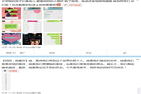 5月10日,beat365官网学生自行发起“妈妈,我爱你”母亲节活动,学生们以微信、电话、做视频等方式向母亲表达了自己的祝福。“内蒙古师大beat365官网网页版团总支”官方微博进行了全程跟踪并发布了活动进展情况