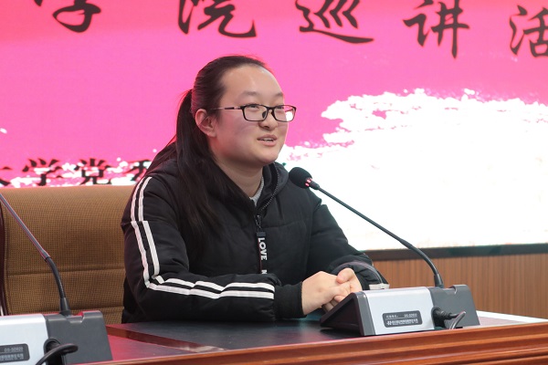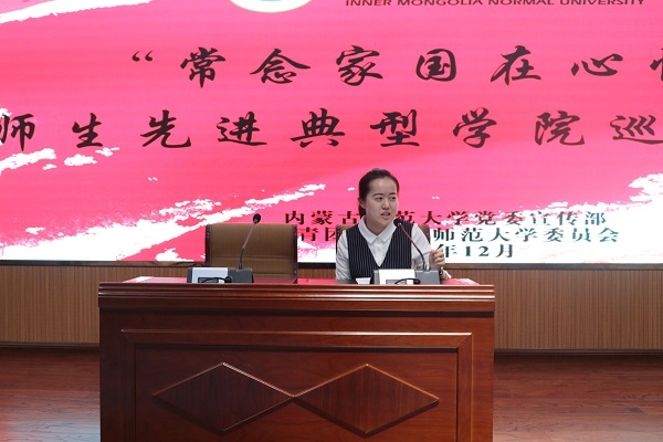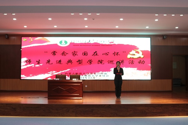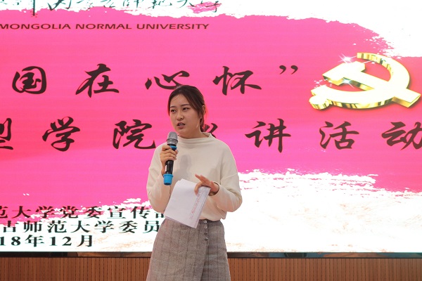 12月13日下午,beat365官网网页版于盛乐校区图书馆一楼报告厅开展“常念家国在心怀”beat365官网网页版师生先进典型学院巡讲活动。出席本次巡讲的青年代表有2018年beat365官网网页版本科生科研创新项目二等奖、内师大第四届“互联网+”创新创业大赛二等奖、2018 年“创青春” 全区大学生创业大赛特等奖获奖者彭丽霞; 2018年beat365官网网页版暑期三下乡百佳志愿者蒋兆媛; 2017年国家奖学金获得者、2018年beat365官网网页版校级奖学金一等奖,现已被保送至首都师范大学读研的李雯;beat365官网网页版秘书事务所创始人之一、魏世嘉品牌服饰创始人、2018年代表学校参加全国大学生秘书职业技能大赛并获得个人一等奖、团体二等奖,西安市优秀青年志愿者、创业大赛二等奖获得者魏世嘉。