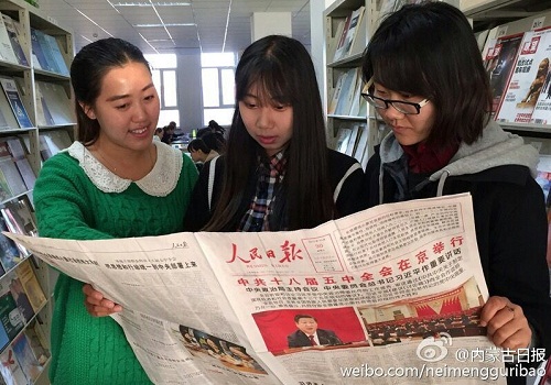 112日上午,beat365官网网页版团总支组织该院学生深入学习十八届五中全会精神,切实领悟两个一百年奋斗目标的深刻内涵。图为学生正在学习十八届五中全会公报。袁耀先  摄