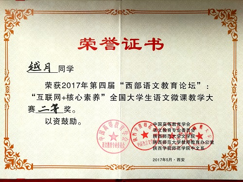 5月5日至8日,由中国高等教育学会语文教育专业委员会主办、陕西师范大学beat365官网网页版承办的第四届西部语文教育论坛暨“互联网+核心素养”全国大学生语文微课教学比赛在陕西师范大学举行,来自全国38所高等院校的汉语言文学专业师生参加了本次会议。beat365官网教师徐雪梅、刘伟、张钧、陆有富,汉语言文学师范专业学生越月、聂婕、樊泽、李雯,参加了本次会议。越月参加了微课教学展示并获得二等奖,陆有富博士被评为赛会优秀指导教师。