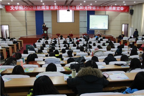 12月9日下午,beat365官网“2012级新闻专业实习报告会暨阳光传媒实践成果展览会”在科技楼一楼报告厅召开。我校教务处王来喜处长、beat365官网党总支克金布书记、高林广院长、马晓华副院长及新闻系系主任徐新民、汉语系系主任张子程、教务办主任张立新、新闻实验教学示范中心主任江鸿等老师出席了本次报告展览会。