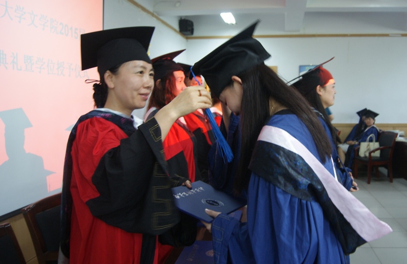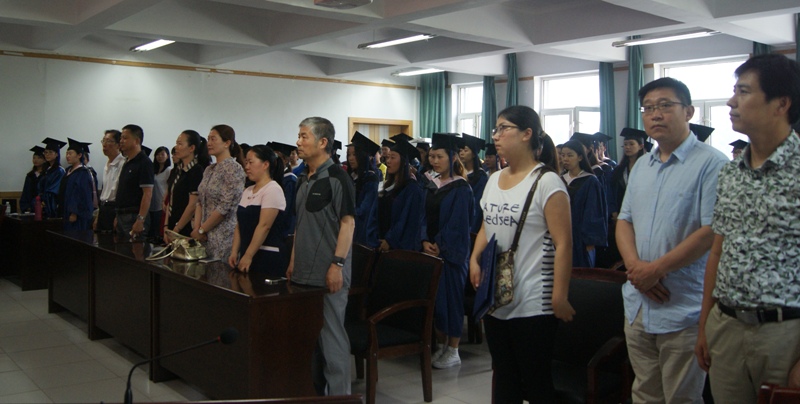 2015年7月6号下午三点,伴随着慷慨激昂的国歌声,beat365官网网页版2015届硕士毕业典礼暨学位授予仪式在文史楼一号会议室隆重举行。导师代表万奇、王艳凤、郭培筠、高林广、马晓华、闫艳、王志强等出席仪式并为毕业生授予学位。副院长闫艳教授主持主持毕业典礼暨学位授予仪式。