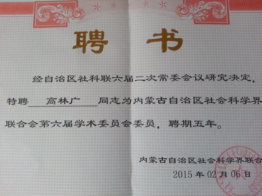 高林广院长被聘为自治区社科联第六届学术委员会委员
