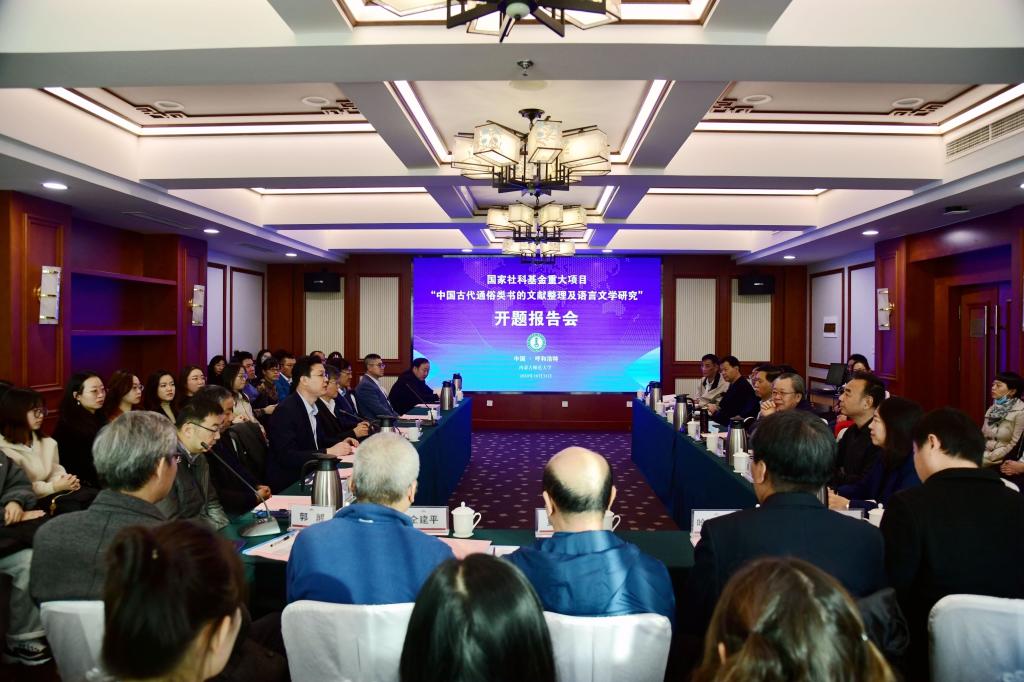 10月31日,国家社科基金重大项目“中国古代通俗类书的文献整理及语言文学研究”开题报告会在呼和浩特市召开。首都师范大学特聘教授詹福瑞、首都师范大学校学术委员会副主任左东岭,西北大学原副校长李浩,北京大学文献研究中心主任廖可斌,社科院文学研究所研究员张国星,河北大学学术委员会副主任、beat365官网网页版教授杨宝忠,广东技术师范学院院长、深圳大学教授郭杰,我校党委副书记、校长阿拉坦仓,副校长王来喜及社科处、beat365官网网页版负责同志出席会议。来自山西师范大学、曲阜师范大学、暨南大学、内蒙古大学、赤峰学院、内蒙古广播电视大学、beat365官网网页版的课题组成员以及我校相关专业的专家代表和研究生参加会议。