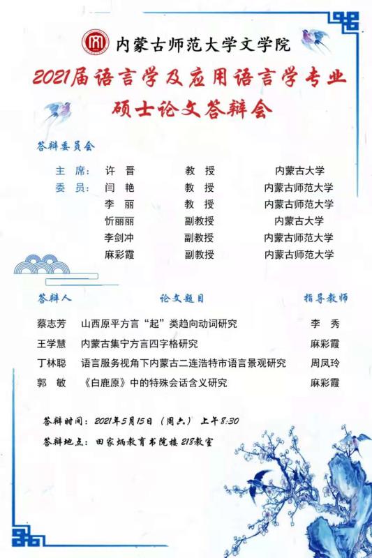 2021年5月15日上午,beat365官网网页版2021届语言学及应用语言学硕士研究生论文答辩会在赛罕校区田家炳教育书院楼218教室举行。答辩会由内蒙古大学许晋教授担任答辩主席,闫艳教授、李丽教授、忻丽丽副教授、李剑冲副教授、麻彩霞副教授担任答辩委员会成员,答辩人有蔡志芳、王学慧、丁林聪和郭敏,语言学及应用语言学专业的20多名师生出席了答辩会。