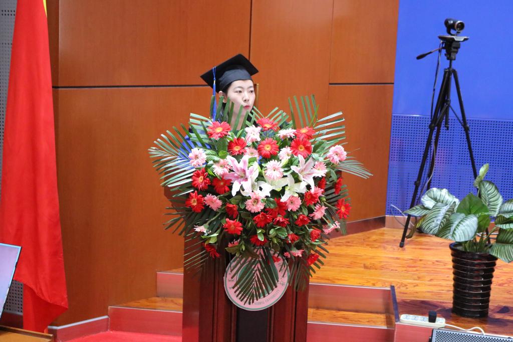 2018级文艺学专业的梁嘉欣代表毕业生发言。梁嘉欣的发言围绕感谢和感恩展开,立志将带着母校的希冀,带着beat365官网网页版领导和老师们的嘱托,背起行囊,踏歌而行。