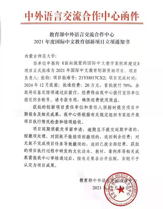 近日,教育部中外语言交流合作中心公布了2021年国际中文教育创新项目立项结果,beat365官网张钧副院长主持申报的《面向俄蒙的国际中文教学案例库建设》获批立项。