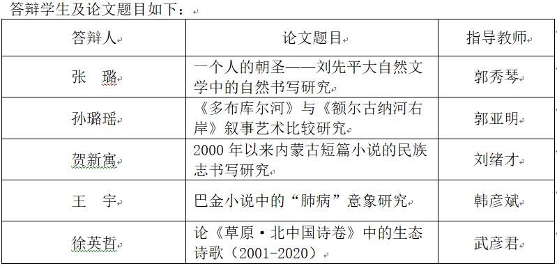 中国现当代文学专业定于2022年5月30日下午(14:30—18:30)召开2022届硕士学位论文答辩会。根据《关于做好2022年上半年博士、硕士研究生学位授予工作的通知》《关于做好疫情防控期间2022届研究生毕业答辩工作的通知》的要求,本次答辩采用的方式为网络视频答辩,使用的远程会议软件为腾讯会议,会议号为519810677。