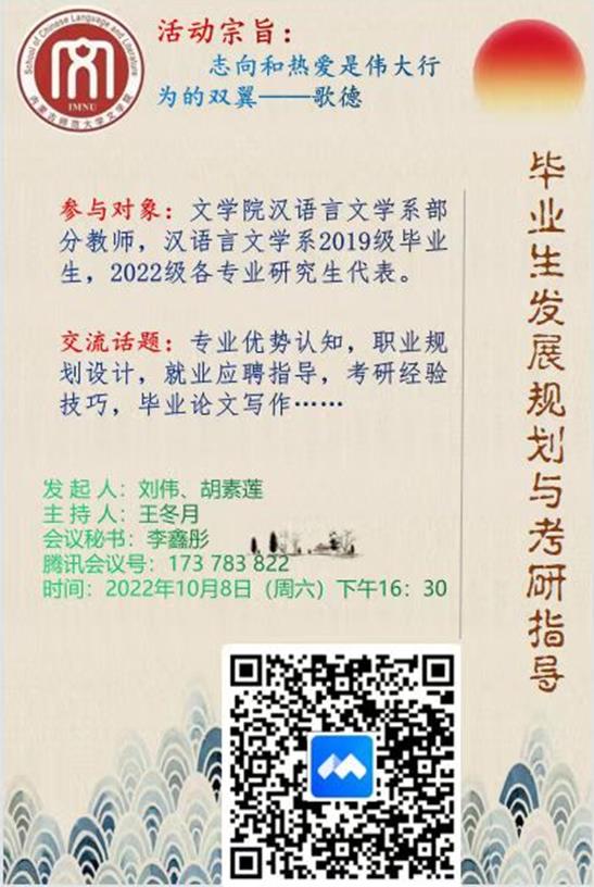10月8日下午,beat365官网汉语言文学系召开毕业生发展规划与考研指导会。受新冠疫情影响,本次会议以云端线上方式进行。汉语言文学系主任、教工第一支部书记刘伟教授,汉语言文学系副主任胡素莲博士,2022级新生班主任张丽娟博士、孙亚楠博士、王雪博士,以及汉语言文学专业2019级本科生、2021级和2022级部分本科生共120余人参加了会议。