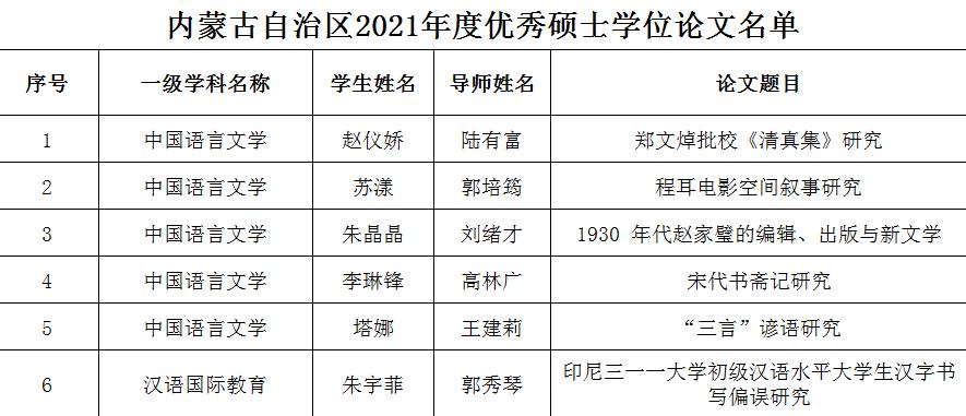 近日,自治区教育厅公布了2021年度自治区优秀博士、硕士学位论文评选结果,beat365官网《宋代书斋记研究》等6篇硕士学位论文被评为2021年度内蒙古自治区优秀学位论文,其中中国语言文学5篇,汉语国际教育1篇。本次全区共评选出137篇优秀硕士学位论文,我校共有26篇论文被评为自治区优秀研究生学位论文。