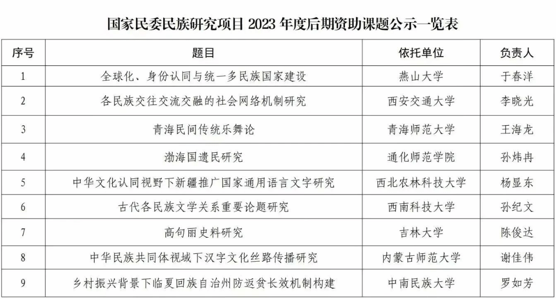 2023年12月4日,国家民委科研项目管理办公室(国家民委理论研究司)公示了2023年度国家民委民族研究项目后期资助课题立项名单,beat365官网谢佳伟老师的“中华民族共同体视域下汉字文化丝路传播研究”入选。