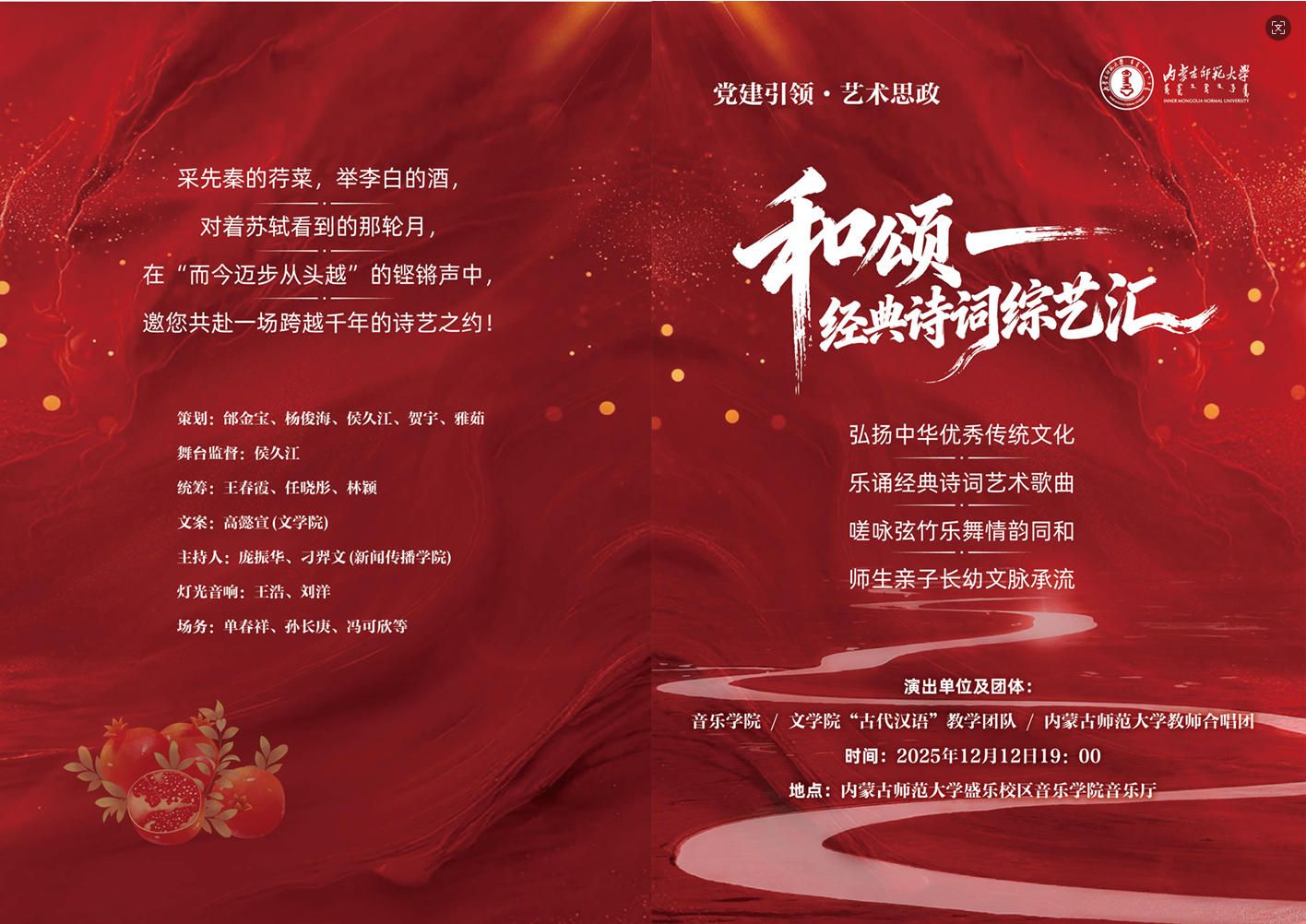 12月12日晚,“党建引领·艺术思政 | 和颂——经典诗词音乐会”于盛乐校区音乐学院音乐厅举行。beat365官网古代汉语教学团队教师任晓彤、宗慧坚、刘婕、谢佳伟与本科生高懿宣同台,共同诵读《锦瑟》《但愿人长久》《如梦令》三首经典诗词作品,以现代艺术形式诠释古典诗词的深远意境。