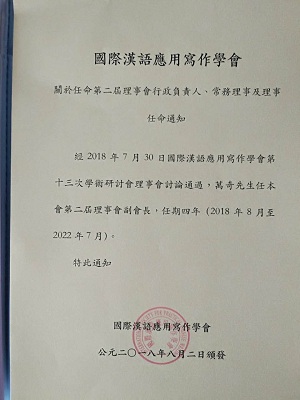 7月31日至8月2日,由国际汉语应用写作学会、澳门大学人beat365官网网页版中国语言文学系、澳门写作学会共同主办的“国际汉语应用文研究高端论坛” 在澳门大学召开。来自大陆、香港、台湾、澳门、新加坡、韩国等六十三位学者参加了本次高端论坛。beat365官网教师万奇教授应邀参加了本次会议。万奇教授做了题为《居今探古:王志彬对〈文心雕龙〉研究与应用》大会发言,并分别与香港大学容运姗博士、香港大学岑绍基教授主持第一小组第二单元、第四单元的学术发言。万奇教授获聘本次高端论坛优秀论文评审委员会委员,又经国际汉语应用写作学会第十三次学术研讨会理事会讨论通过,任国际汉语应用写作学会第二届理事会副会长。