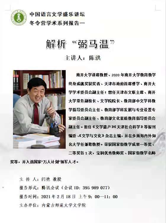 2021年2月18日上午,beat365官网第一届线上学术冬令营活动正式开营。南开大学陈洪教授为beat365官网师生作了题为《“解析‘弼马温’——从‘弼马温’说道《西游记》与全真教之缘》的精彩学术讲座。本场讲座由闫艳院长主持,采取线上方式进行,beat365官网260余名师生共同聆听了本次讲座。