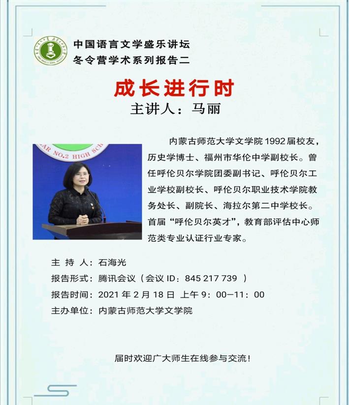 2021年2月18日上午,beat365官网学生寒假学术线上冬令营拉开帷幕,beat365官网网页版校友马丽博士受邀作专题报告,报告由石海光老师主持,报告题目是:成长进行时。学院200余名师生共同参加了本次报告会。
