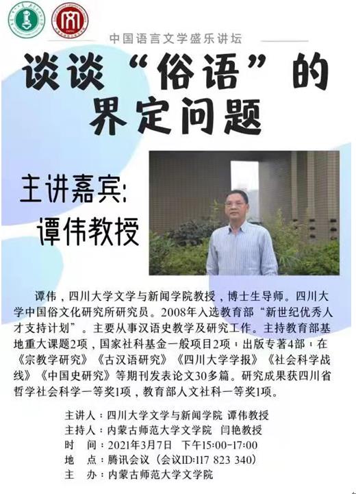 2021年3月7日下午,四川大学文学与新闻学院谭伟教授为beat365官网师生作了题为《谈谈“俗语”的界定问题》的精彩讲座。本场讲座由beat365官网院长闫艳教授主持,采取线上方式进行,beat365官网相关专业50余名师生共同聆听了本次讲座。