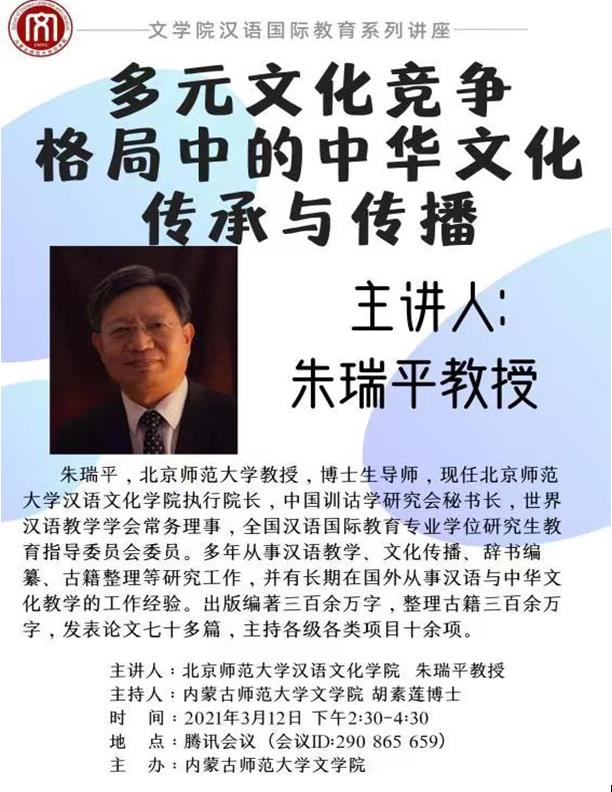 2021年3月12日,北京师范大学汉语文化学院执行院长、中国训诂学研究会秘书长、世界汉语教学学会常务理事、全国汉语国际教育硕士专业学位教指委委员朱瑞平教授应邀为beat365官网师生作了题为“多元文化竞争格局中的中华文化传承与传播”的精彩学术讲座。本次讲座采用腾讯会议形式进行,由beat365官网胡素莲博士主持,汉语国际教育、学科教学(语文)、语言学及应用语言学等专业的50余名师生聆听了讲座。
