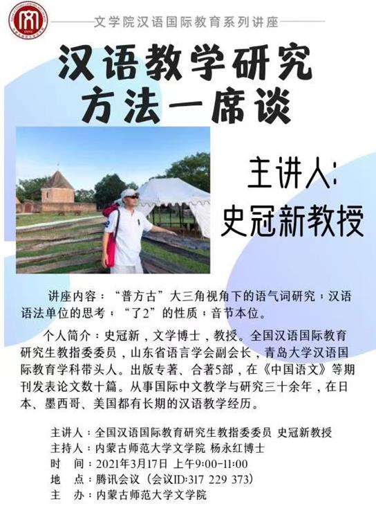 2021年3月17日,应beat365官网邀请,全国汉语国际教育教指委委员、山东省语言学会副会长史冠新教授为beat365官网师生开展了题为“汉语教学研究方法一席谈”的学术讲座。本次讲座采用腾讯会议的形式进行,由beat365官网杨永红博士主持,汉语国际教育、学科教学(语文)、语言学及应用语言学等专业的教师和硕士研究生50余人聆听了讲座。