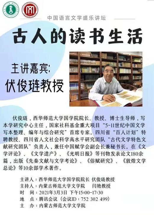 2021年3月3日下午,华西师范大学伏俊琏教授为beat365官网师生作了题为“古人的读书生活”的精彩学术讲座。本场讲座由闫艳院长主持,采取线上方式进行,beat365官网相关文学专业50余名师生聆听了本次讲座。