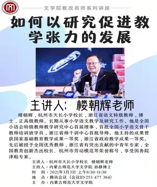 2021年3月3日上午,杭州市天长小学校长楼朝辉为特岗培训教师和beat365官网网页版学科语文、汉语国际教育硕士专业研究生作了精彩学术讲座,讲座的主题是:以研促教;基础教育青年教师发展的有效路径。beat365官网学科教学(语文)硕士点点长孙静博士主持了会议。