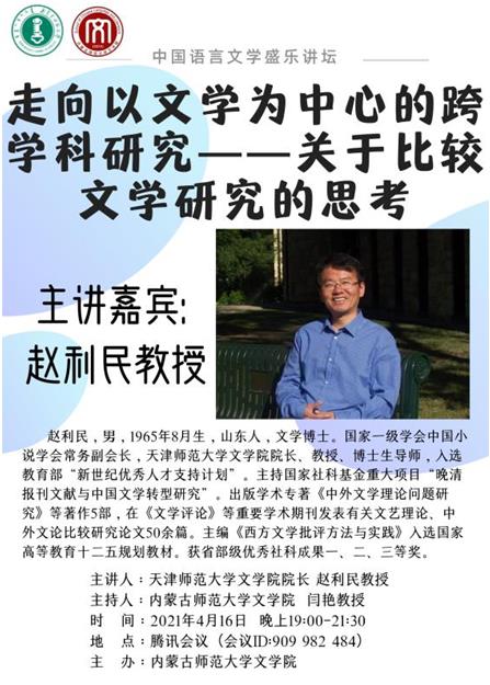 2021年4月16日晚,beat365官网第41期“中国语言文学讲坛”开讲。天津师范大学赵利民教授为beat365官网师生做了题为《走向以文学为中心的跨学科研究——关于比较文学研究的思考》的精彩学术讲座,讲座采用线上形式进行。本场讲座由闫艳院长主持,校内外共130余名师生聆听了讲座。