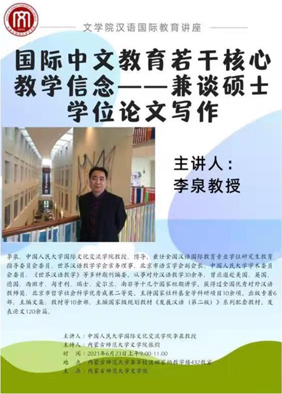 2021年6月23日,应beat365官网邀请,全国汉语国际教育专业学位研究生教育指导委员会委员、世界汉语教学学会常务理事、中国人民大学国际交流学院李泉教授为beat365官网师生作了题为“国际中文教育若干核心教学信念——兼谈硕士学位论文写作”的学术讲座。本次讲座的地点为赛罕校区田家炳教育书院432多媒体教室,由beat365官网网页版院长张钧教授主持,汉语国际教育、学科教学(语文)等专业的教师和硕士研究生40余人聆听了讲座。