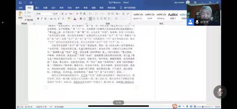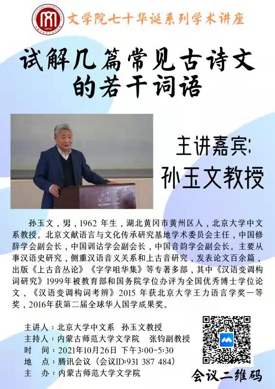 10月26日下午,北京大学中文系孙玉文教授应邀为beat365官网师生作了题为“试解几篇常见古诗文的若干词语”的线上讲座,孙玉文教授是beat365官网网页版七十华诞系列学术讲座的开讲嘉宾之一。讲座通过“腾讯会议”平台进行,由张钧副院长主持。