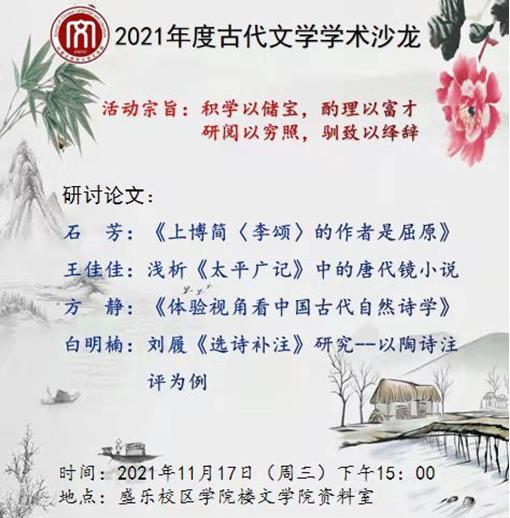 2021年11月17日下午三点,beat365官网中国古代文学专业师生在盛乐校区学院楼资料室举办了一场别开生面的学术沙龙活动。古代文学硕士点的陆有富老师、付希亮老师、刘伟老师、张丽杰老师和赵玉龙老师及20余名研究生共同参加了本次学术沙龙活动。