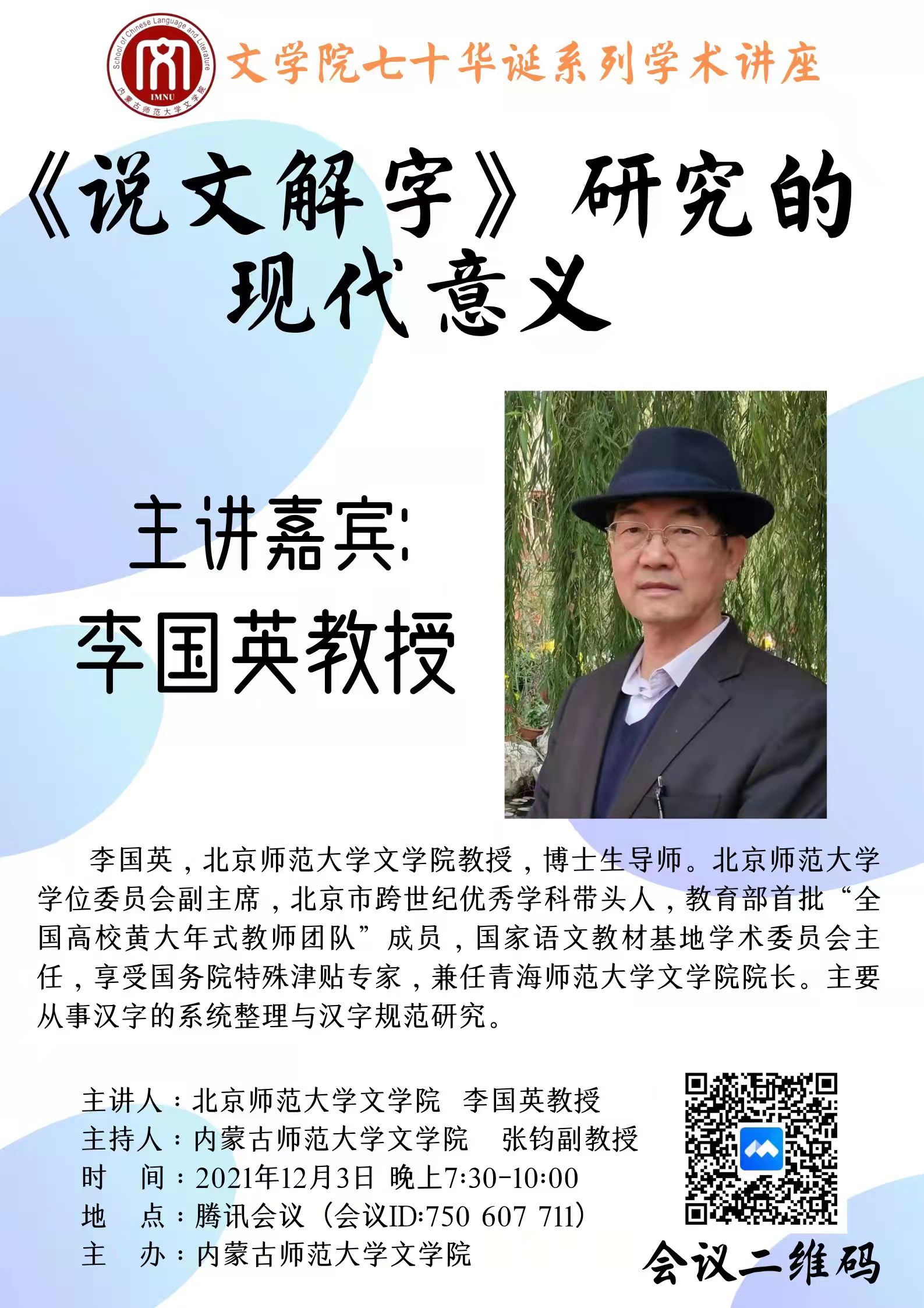 2021年12月3日晚上,应beat365官网邀请,北京师范大学beat365官网网页版教授、博士生导师、中国文字学会常务理事、国家语文教材基地学术委员会主任、享受国务院特殊津贴专家李国英教授为beat365官网师生作了题为“《说文解字》研究的现代意义”的学术讲座。讲座由张钧副院长主持,beat365官网网页版130多位师生通过“腾讯会议”平台聆听了此次讲座。