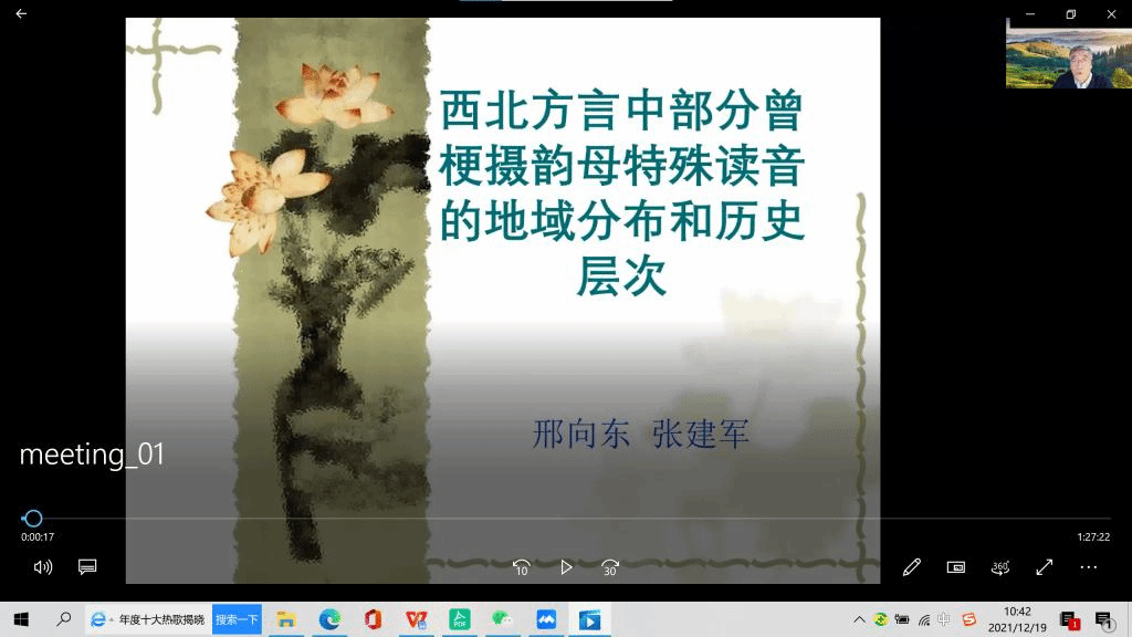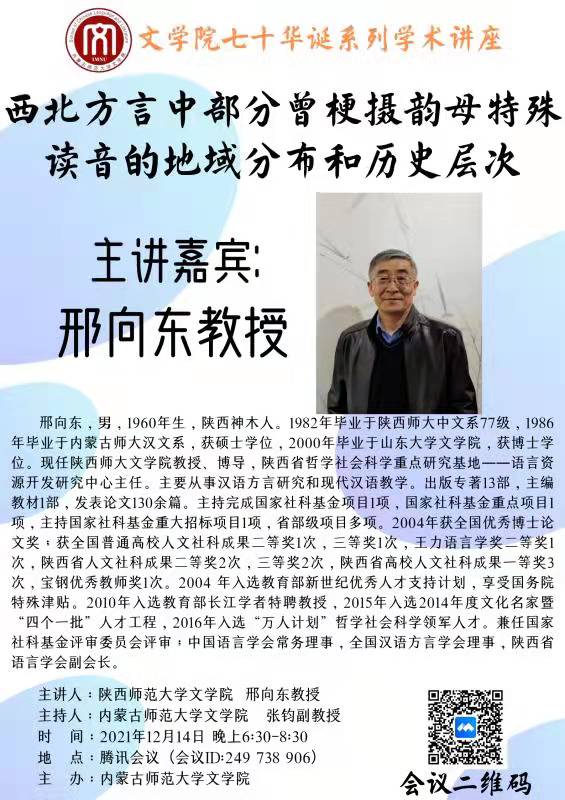 12月14日晚,陕西师范大学beat365官网网页版邢向东教授应邀为beat365官网师生作了题为“西北方言中部分曾梗摄韵母特殊读音的地域分布和历史层次”的线上讲座。邢向东教授1986年在beat365官网(当时为汉文系)获硕士学位,并在汉语言文学系工作多年。邢向东教授是beat365官网网页版七十华诞系列学术讲座的特邀校友嘉宾。讲座通过“腾讯会议”平台进行,由张钧副院长主持。