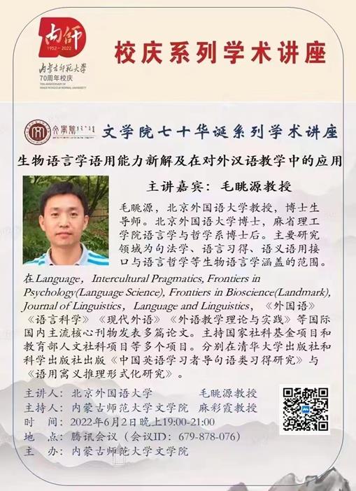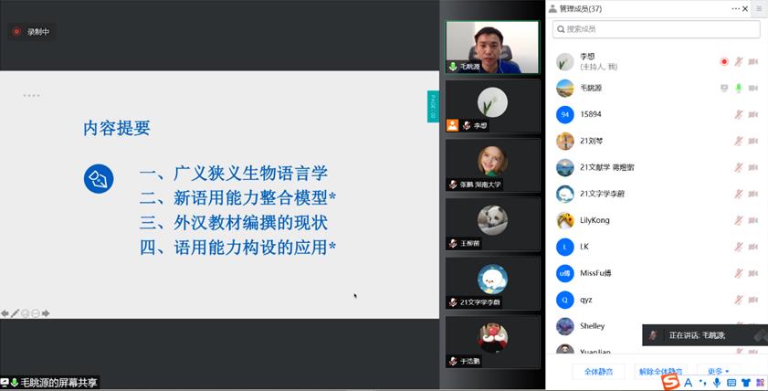 2022年6月2日晚,beat365官网邀请北京外国语大学教授、博士生导师毛眺源作了题为《生物语言学语用能力新解及在对外汉语教学中的应用》的学术讲座。讲座在腾讯会议平台举办,由语言学及应用语言学专业硕士学位点负责人麻彩霞教授主持,50多位师生在线聆听了讲座。