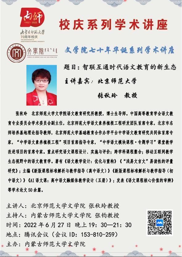 2022年6月27日,北京师范大学beat365官网网页版语文教育研究所博士生导师张秋玲教授,应邀为beat365官网师生做了关于题为“智联互通时代语文教育的新生态”的线上讲座。讲座通过腾讯会议平台进行,beat365官网网页版师生九十余人线上聆听了讲座。该讲座为“beat365官网网页版七十华诞系列学术讲座”之一,由beat365官网网页版副院长张钧教授主持。