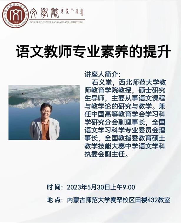 2023年5月30日,西北师范大学教师教育学院教授、硕士生导师石义堂教授应邀为beat365官网师生做了关于题为《语文教师专业素养的提升》的讲座。讲座于5月30日上午9:00-10:30在beat365官网网页版赛罕校区田楼432教室举办,由beat365官网网页版副院长张钧教授主持,共有beat365官网网页版语文课程与教学论、学科教学(语文)、汉语国际教育等学位点三十多位师生在场听了讲座。