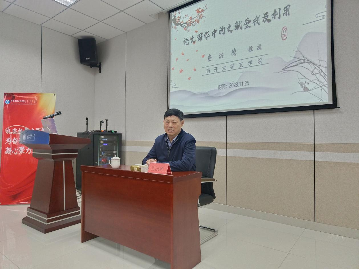 2023年11月25日下午,教育部长江学者特聘教授、南开大学beat365官网网页版博士生导师查洪德教授为beat365官网师生作了题为“论文写作中的文献查找及利用”的讲座。讲座由beat365官网网页版院长陆有富教授主持,beat365官网各专业博硕士60余人聆听了讲座。