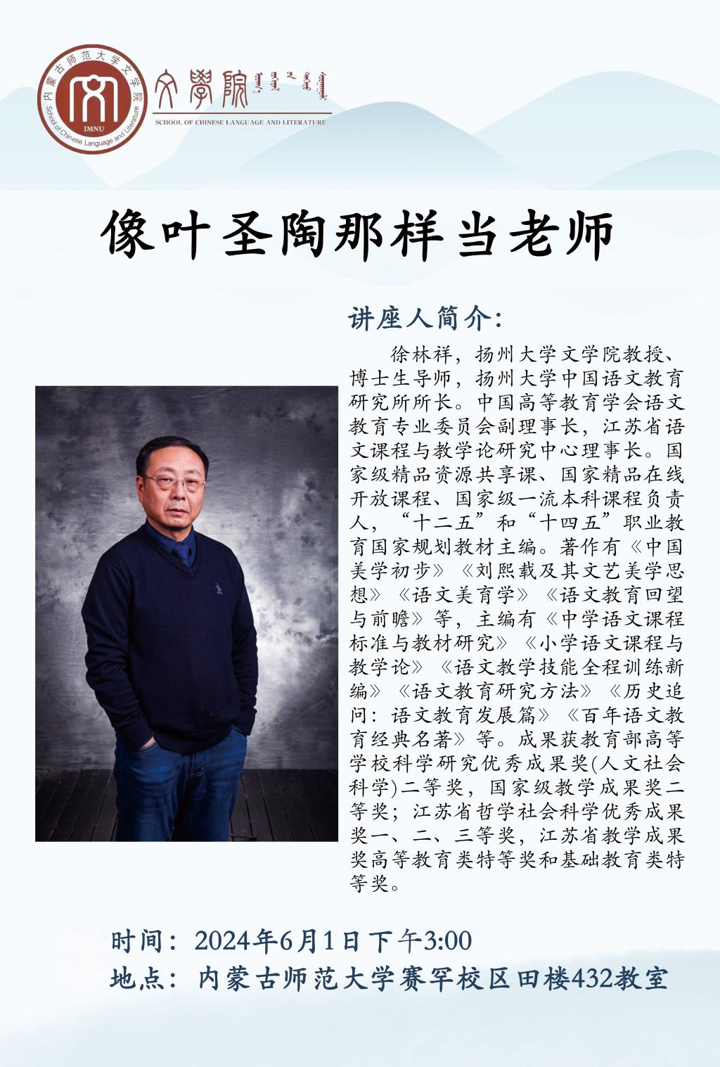 2024年6月1日下午,扬州大学beat365官网网页版教授、博士生导师徐林祥教授在田家炳教育书院432教室为beat365官网师生作了题为“像叶圣陶那样当老师”的学术讲座。讲座由副院长张钧教授主持。