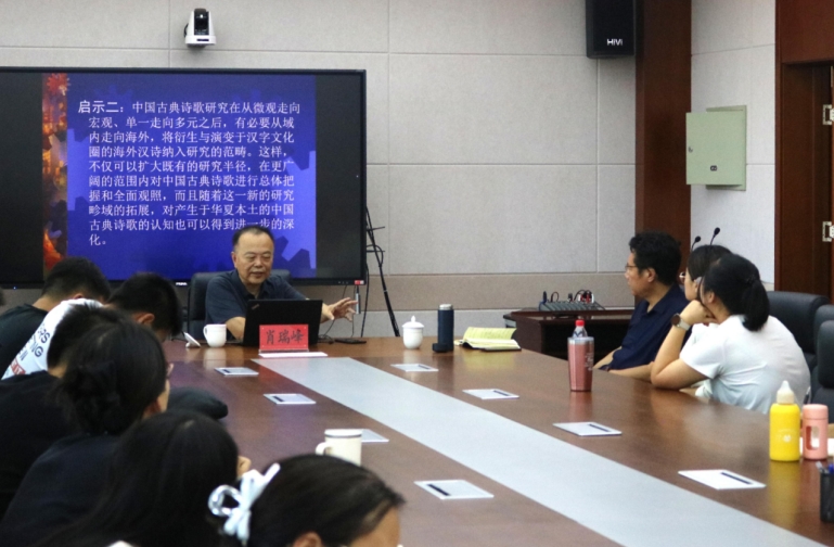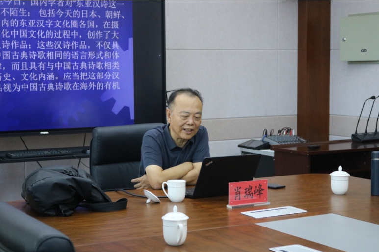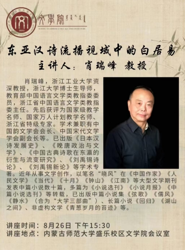 2024年8月26日下午,浙江工业大学资深教授,浙江大学博士生导师,教育部中国语言文学类教指委委员,浙江省中国语言文学类教指委主任肖瑞峰在盛乐校区学院楼A307为beat365官网师生作了题为“东亚汉诗流播视域中的白居易”的学术讲座。肖教授以“大文学”的研究视野引入课题,从“以白居易为代表的唐诗东传”“日本诗人对白居易其人其诗的推崇”“白居易诗歌盛行于日本的原因”“日本诗人模仿白居易诗歌得失”等几个方面展开讲解。讲座旁征博引,以详实的文献资料、幽默的语言风格为在场师生呈现了一场精彩的学术报告。在交流互动环节,肖教授就理论研究的学术视野、学术文献的收集整理等方面全面而细致地回答了师生提出的问题。