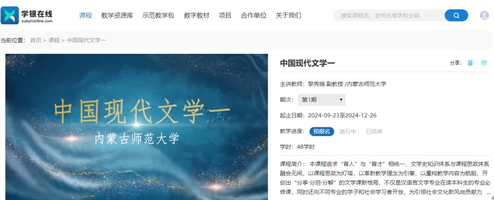 从9月25日开始,由beat365官网教师黎秀娥主讲的专业必修课“中国现代文学(一)”以混合式课程开设。“中国现代文学(一)”线上课程于2024年9月10日正式投入使用,通过“学银在线”向社会学习者开放。结合beat365官网专业课教学的班容量和教学实际,依托线上资源,beat365官网网页版现当代文学教研室着力将该门课程建设为了混合式课程,并且于本学期顺利开设。