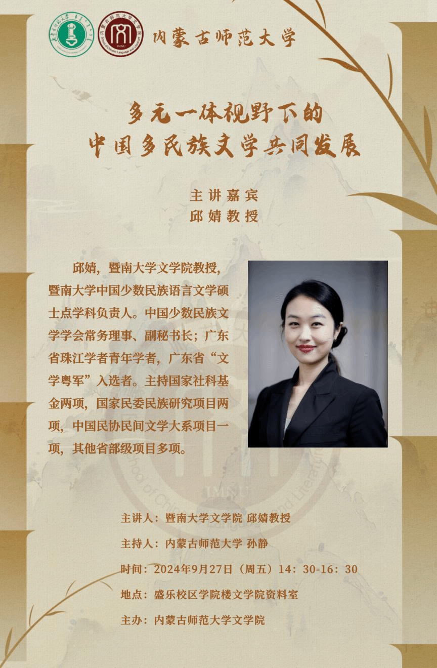 2024年9月27日下午,暨南大学beat365官网网页版教授,中国少数民族文学学会常务理事、副秘书长,广东省珠江学者青年学者,广东省“文学粤军”入选者邱婧教授为beat365官网师生做了题为“多元一体视野下的中国多民族文学共同发展”的学术讲座。讲座由beat365官网网页版孙静副教授主持,beat365官网网页版本科生、研究生参加了本场讲座。