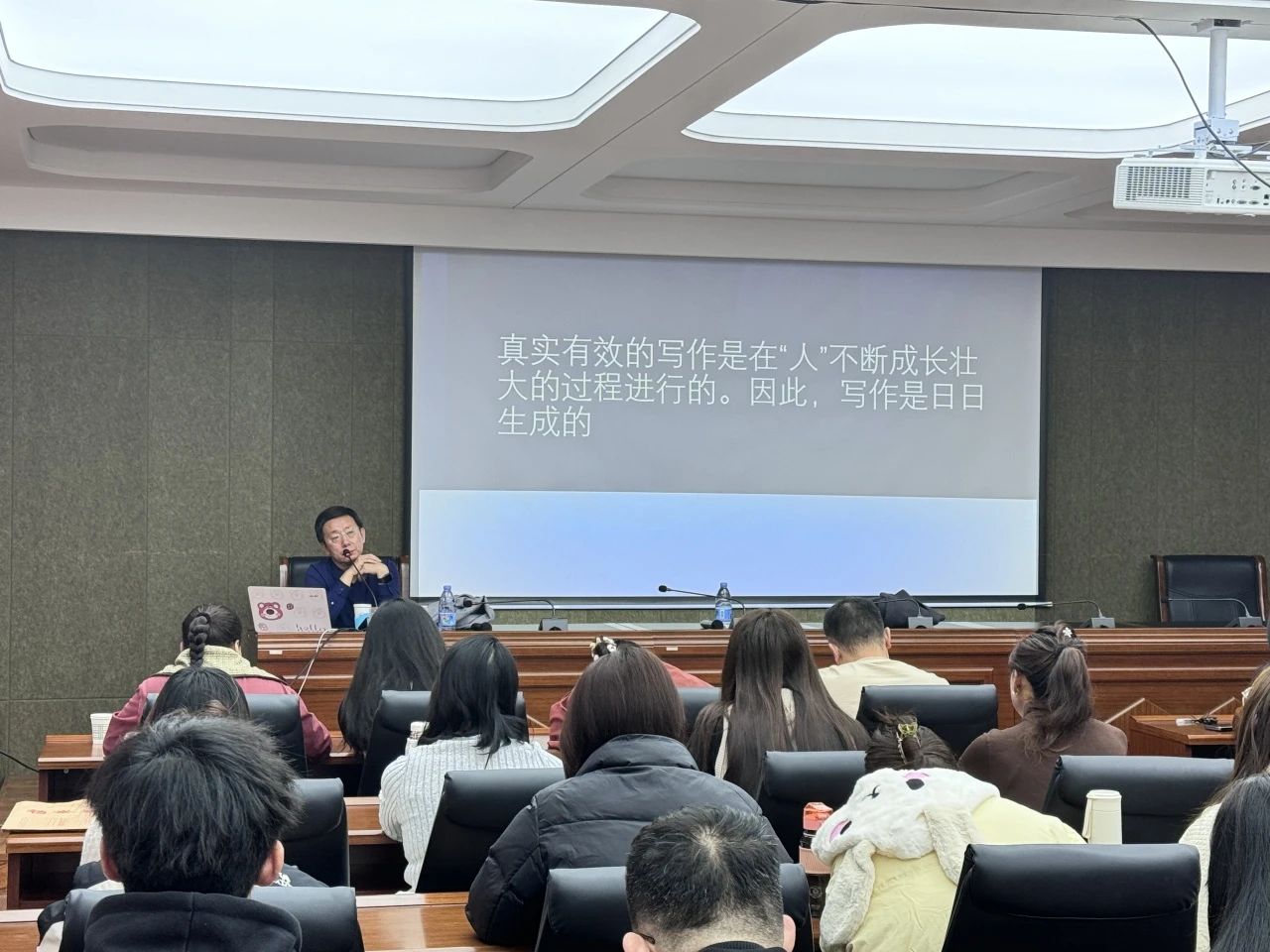 2024年11月23日上午,北京市特级教师,中国语文报刊协会写作教学专业委员会副理事长,中国教育学会“领航计划”专家连中国老师,为beat365官网师生作了题为“写作:人的完整即文的完整”的讲座。讲座由陆有富教授主持,相关专业教师和研究生聆听了讲座。