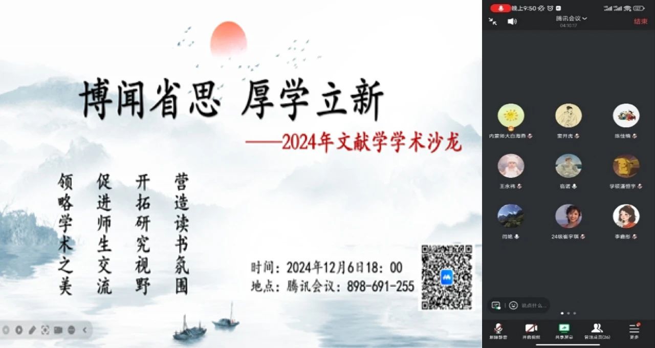 2024年12月6日,中国古典文献学学位点研究生学术沙龙于线上举行。闫艳教授,窦开虎副教授、张丽华副教授、庄国瑞副教授、白海燕副教授、马奥远老师及本专业在读研究生参与了学术沙龙,本次学术沙龙由学位点负责人白海燕老师主持。各位老师对每位研究生的论文进行了全面深入、细致的点评,从论文选题、内容、形式、写法等多维度提出修改意见。2024级研究生高子涵、王娜等七位同学依次汇报了读书笔记并提出读书、学习中遇到的各种问题,各位老师对每位研究生的问题予以耐心解答。
