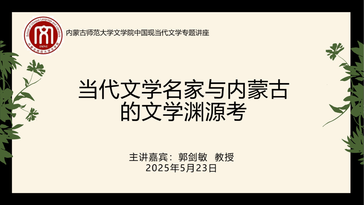 2025年5月23日下午,浙江工商大学人文与传播学院教授、硕士生导师,英国切斯特大学访问学者,浙江省中国当代文学研究会副秘书长郭剑敏教授,应邀在赛罕校区田楼728会议室为beat365官网师生带来一场精彩的学术讲座,题目是“当代文学名家与内蒙古的文学渊源考”。讲座由beat365官网网页版孙静副教授主持,相关专业教师、beat365官网网页版硕士研究生参与了此次讲座。